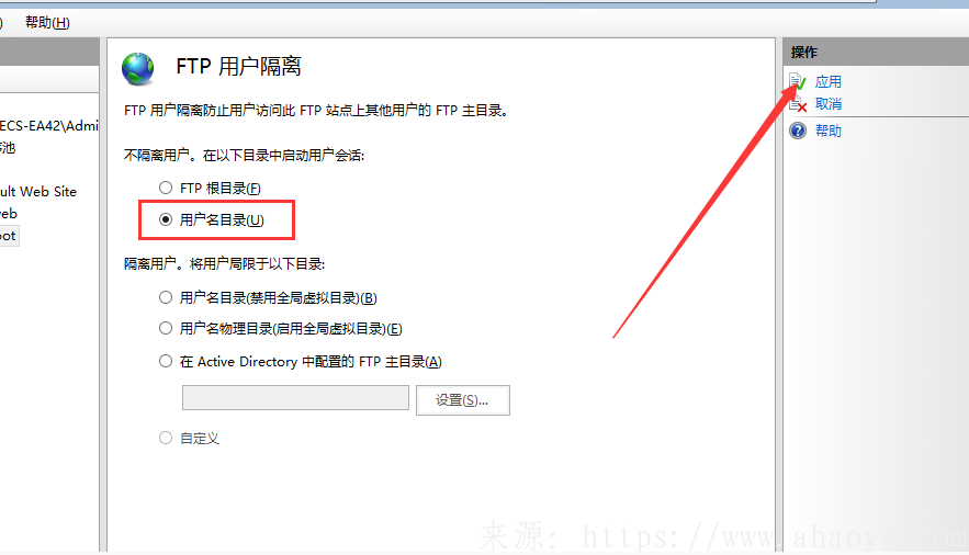 完成后切换到FTP的功能视图,进入 “FTP 用户隔离”